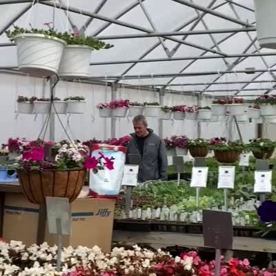A man and young girl play hide and seek in a greenhouse, but the man is falling closely behind the girl and startles her at the end.