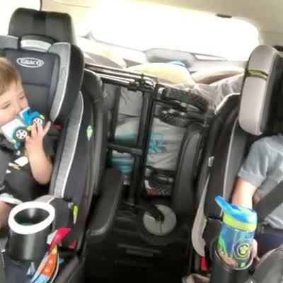 "Car Seat Hide and Seek" Two tot boys in car seats in the back of a car play Hide-and-seek and count and then say, "Found you!" as they look back at each other.
