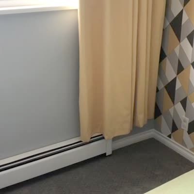 A woman screams and laughs in a hotel room when she takes the covers off of a bed in a hotel room and finds her friend hiding under the bedding.