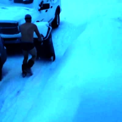 A man is taking trash can to curb while in his underwear. There's snow on the ground.
