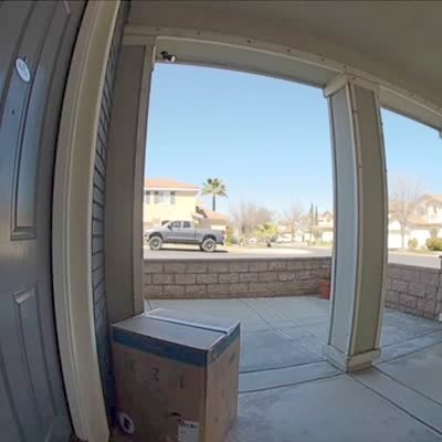 A woman hides inside a cardboard box on a porch and scares a senior man and woman. Security footage.
