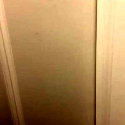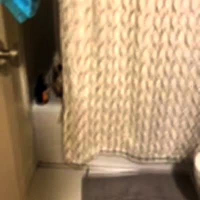 Shreds of junk are littered across a floor. A Golden Doodle hides in a shower. A woman pulls the curtain back and says to the dog, "Ogden, what did you do? Did you get in the trash?"