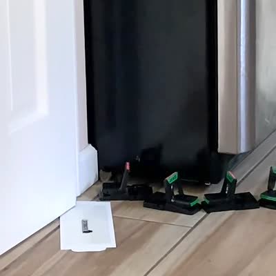 A mouse evades a dozen mouse traps set around its hiding spot under the refrigerator.