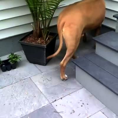 A woman tells a dog it's time to get a bath. The large dog walks across the patio and hides behind a small potted plant.