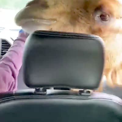 A camel leans into a car at a drive-thru safari park, then a woman crawls backwards into the backseat as the group of women laugh.