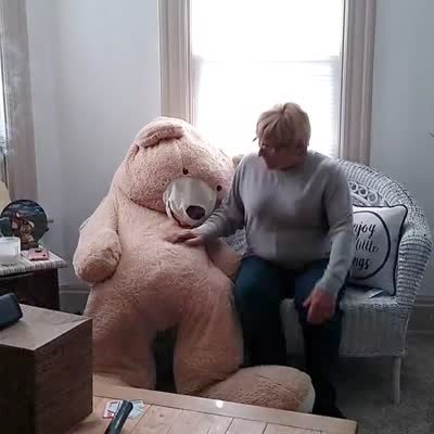 A senior woman sits and poses for a photo with a giant teddy bear, and someone inside the bear moves and scares her.