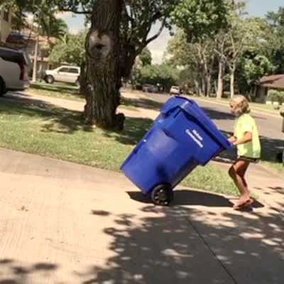 A girl rolls a trash can up the driveway and another girl, who's hiding inside, pushes the lid up to prank the first girl, hitting her in the face with the lid.
