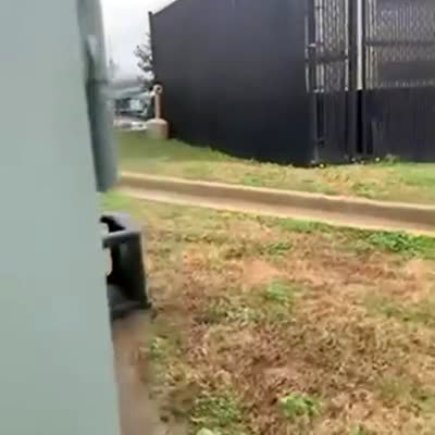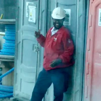 A construction worker leans against the door of a port-a-potty preventing his coworker from exiting. He then hides in the next toilet allowing his confused coworker to escape.