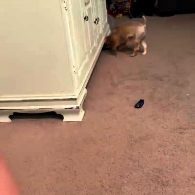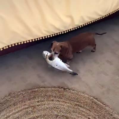 A woman finds her dog with a fish in his mouth in her bedroom. She tries to get him out of the house, but he walks into another room and hides under the bed.