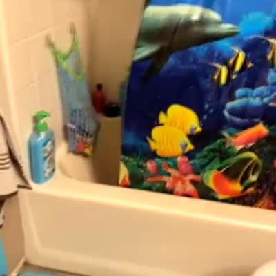 A woman walks into a bathroom. She finds a tot girl in pajamas hiding behind the shower curtain holding a bottle of ranch dressing. She drinks the dressing from the bottle.