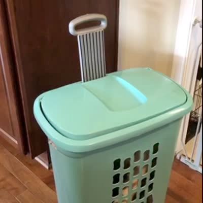 A Golden Retriever puppy dog plays in a laundry hamper.