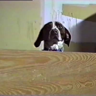 A dog runs away in a hallway and hides when he sees an inflatable dinosaur.