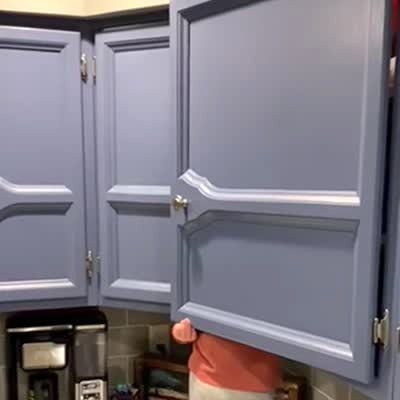 A cat hiding in a cabinet opens the door and pulls on the tail of a second cat, startling it and causing it to be wedged between the cabinet door and the floor.