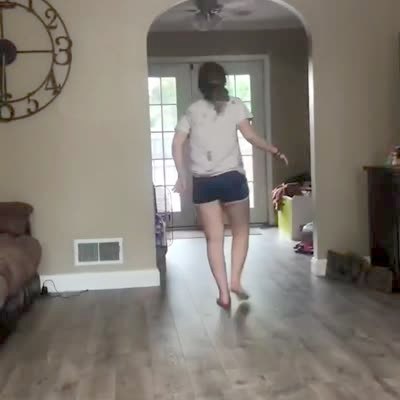A teen girl hides around the corner and a man walks out of the bathroom and looks down at a dog and she jumps out and says "pow!" and he jumps and shouts "don't do that" and almost falls.