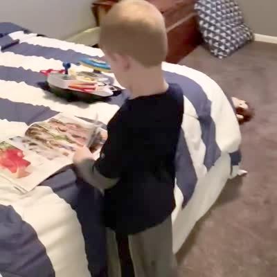 A young boy hides his haircut under a bedroom blanket. When he reveals it, he is completely bald.