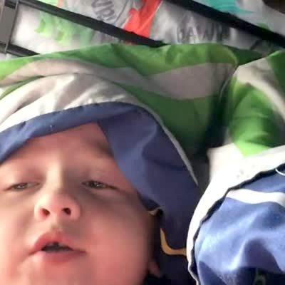 A man is fast asleep on a young boy's bed. The boy walks in and throws a toy at his back and hides. The man doesn’t respond to this, the tot boy comes out and starts to walk towards the man. The man throws a pillow directly in his face. They both laugh. Security footage.