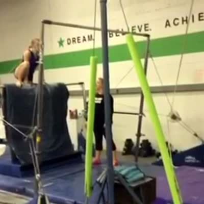 A man swings on a gymnastics bar in a gym and slips and falls off of it.