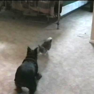 Cat and dog are playing. Cat jumps high and turns around in the air