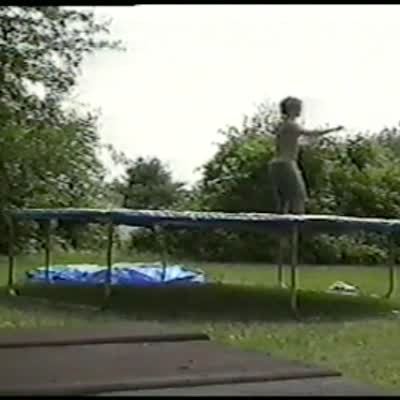 3 teens jump off shed roof onto trampoline. 1 boy bounces high, hits side of the shed, crashes between shed tramp onto grass. Hard fall.
