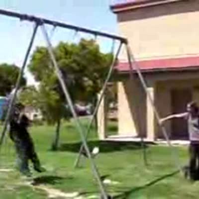 Man swinging high jumps off swing but gets caught by his shirt & falls to the ground. Backyard.