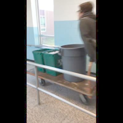 A teen boy rides a hand dolly down a ramp. The dolly crashes into a rail and the garbage cans on the dolly are thrown off.