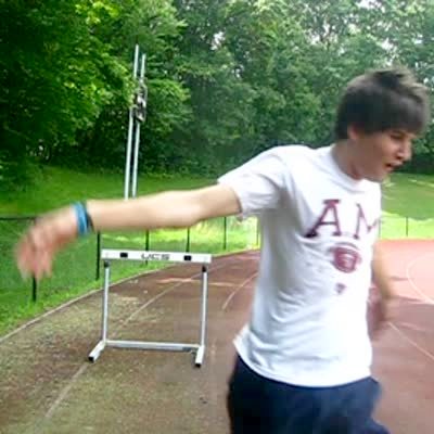 A teen boy jumps a hurdle on an outdoor high school track. Another teen boy tries to jump over the hurdle, hits his crotch on the hurdle and the hurdle cracks and breaks. Camera jerks away and shuts off during impact. No tails.