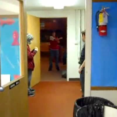 A teen boy runs through a high school hallway, jumps, and hits his head on top of the doorway on purpose. Short heads. Short tails. Bonehead.