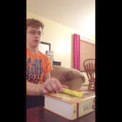 A teen boy flips a highlighter and after several attempts it lands on the cap.
