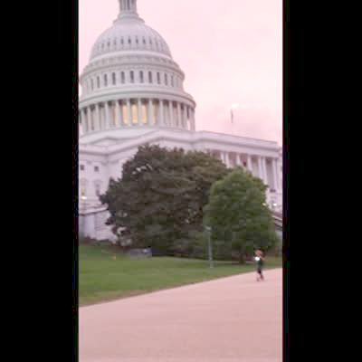 A woman rides a scooter down a sidewalk at the Capitol Building but swerves and falls down and another woman films and yells at her not to break a hip.