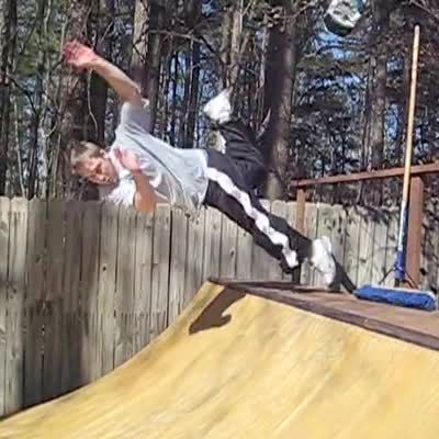 Teen boy rides skateboard down a ramp and up another ramp. He falls hard, skateboard lands in the trees above him. With recovery. Skate park.