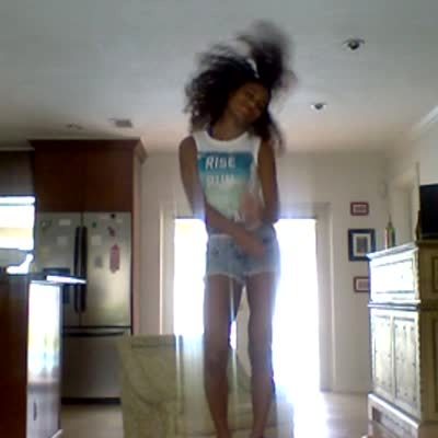 A teen girl dances to a hip hop song indoors when the ottoman she's standing on tips over and she falls.