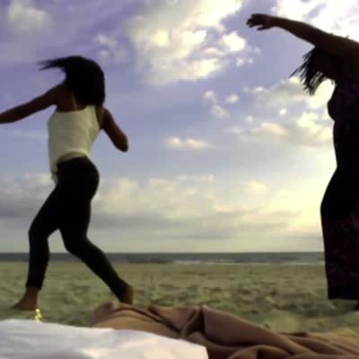 Two women dance on a beach for the camera to hip hop music. One twirls, accidentally knocking into the other.