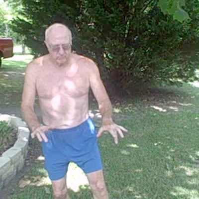 Senior man wearing only blue shorts dances some hip hop moves in the backyard.