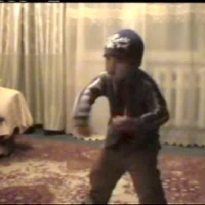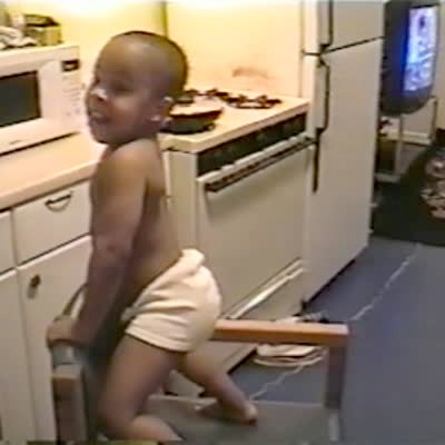 Young boy dancing very well to Kris Kross (hip hop) in the house.