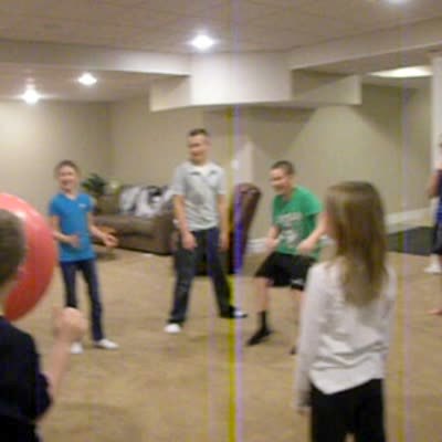 Young teen boys and girls stand in a large circle and hit an exercise ball with their hips to another person. Young girl gets hit in the face and falls over.