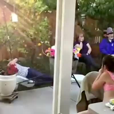 A woman dances in a backyard and bumps another woman with her hip. She stumbles across the back-porch and falls over a chair.