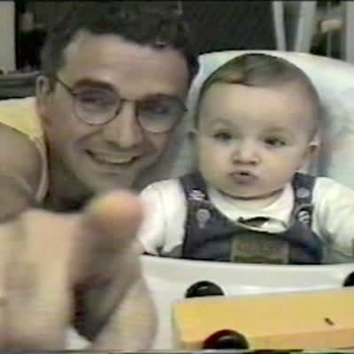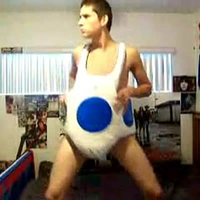 Man wears a weird costume that looks like a plastic diaper with overalls. He dances for the camera while music plays in the background.