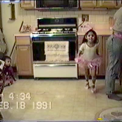 BALLERINA. Little ballerina dances on kitchen floor, falls on her face.