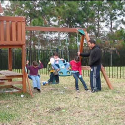Two girls and two boys swing on a swing set. Man takes a swing seat from one of the kids. His swing seat breaks and he falls to the ground.