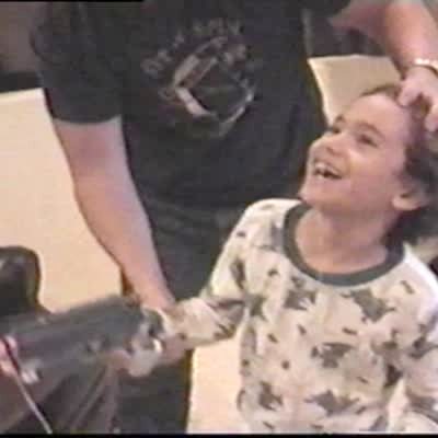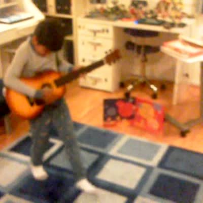 Boy dances, pretends to play guitar in living room, slips and falls. Loud bang.