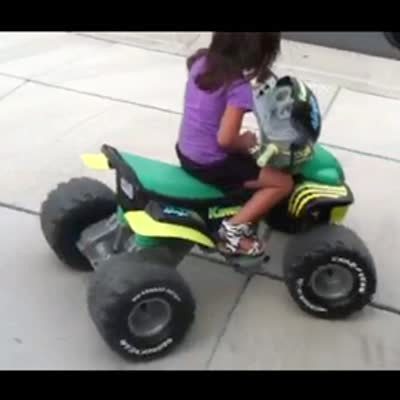 A girl rides up a driveway on an electric toy car ATV and gently bumps into two trucks. She drives across the road, bumps into another truck and sets its alarm off. A man runs over to her.