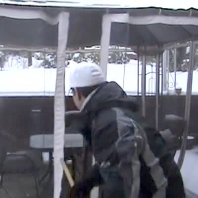 Man walks into backyard gazebo and tries to knock snow off the roof. The whole gazebo crashes onto his head.