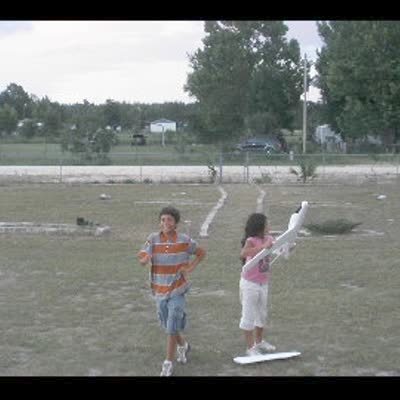 Man throws a styrofoam airplane off the patio, plane does flips and hits a boy, knocking him down.