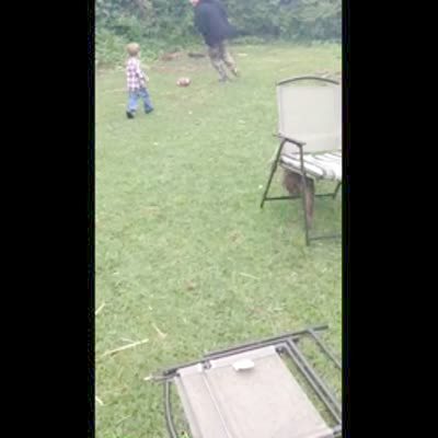 A hog pig chases a tot boy and man around outdoors and knocks the boy over.