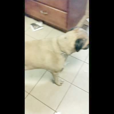 "Dog Tries to Hog Tie" An English bulldog dog wraps its leash around a woman's legs repeatedly in a veterinarian's office, then she falls down. Security footage.