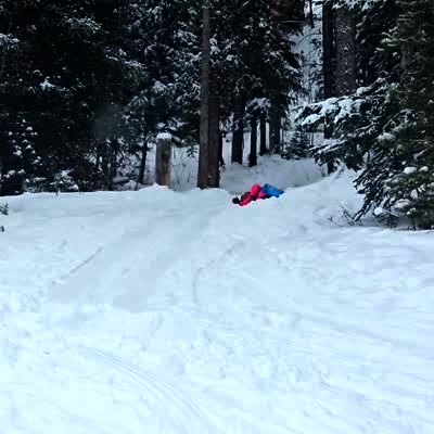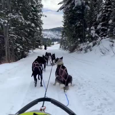 A sled dog starts to stumble and slide over the reigns as it tries to squat and go to the bathroom while pulling a sled through a snowy trail.