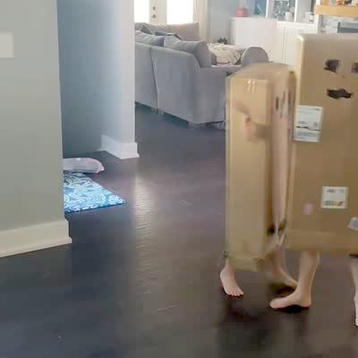 A tot boy and a young boy wear cardboard boxes with holes in them for their eyes and mouth. They hit each other and eventually both fall.