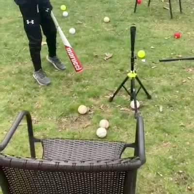 A young boy hits a baseball off of a tee in the backyard, and it breaks through the net and breaks a hole in the fence.