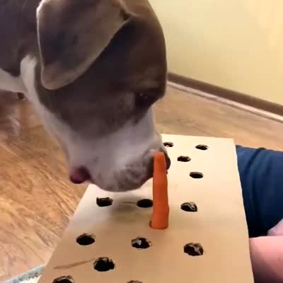A dog bites at a carrot as it goes through holes in a box. The dog then bites at the carrot and walks away with the carrot and the whole box.