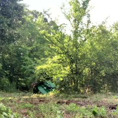 A man drives a tractor and uses it to clear a field and the tractor crashes and falls into a sink hole.